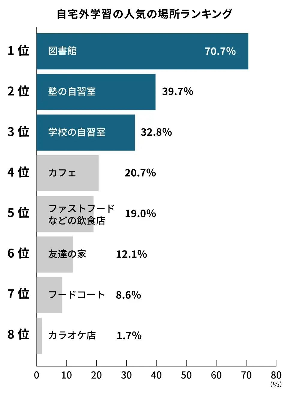 カラオケ店(1.7%): 少数派ですが、個室で集中したい、声を出して学習したいといった特定のニーズがある場合に利用されているようです。