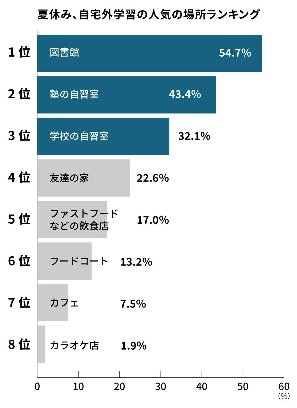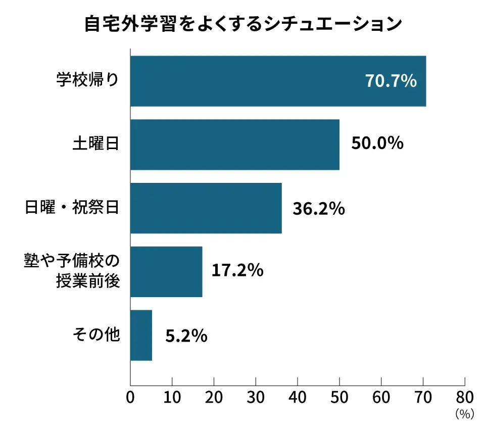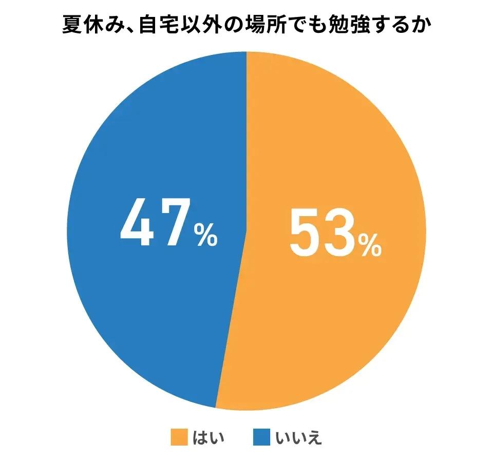 今回の調査で、高校生の58%が学期中に、53%が夏休み中に自宅以外の場所で勉強していることが分かりました。