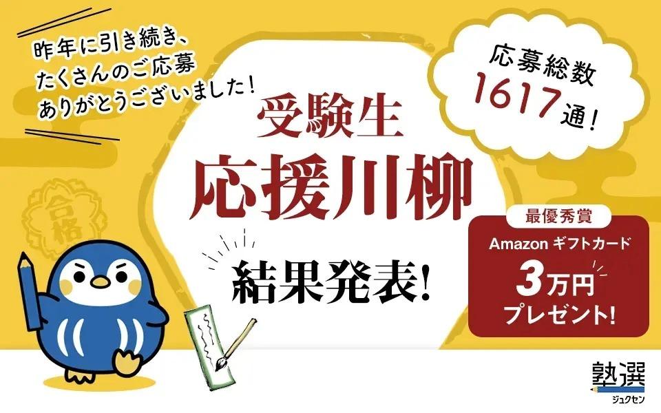 株式会社DeltaX(本社:東京都港区、代表:黒岩 剛史)が運営する日本最大級の学習塾検索サイト『塾選』は、2025年10月14日(火)から2025年11月14日(金)にかけて、「受験生応援川柳」の募集企画を実施しました。本企画には、昨年を上回る数の応募が全国から寄せられ、受験生を応援する想いが広がる大きな盛り上がりを見せました。このたび、応募総数1,617句の中から、最優秀賞1作品、優秀賞1作品、佳作1作品を選出しましたので、発表いたします。